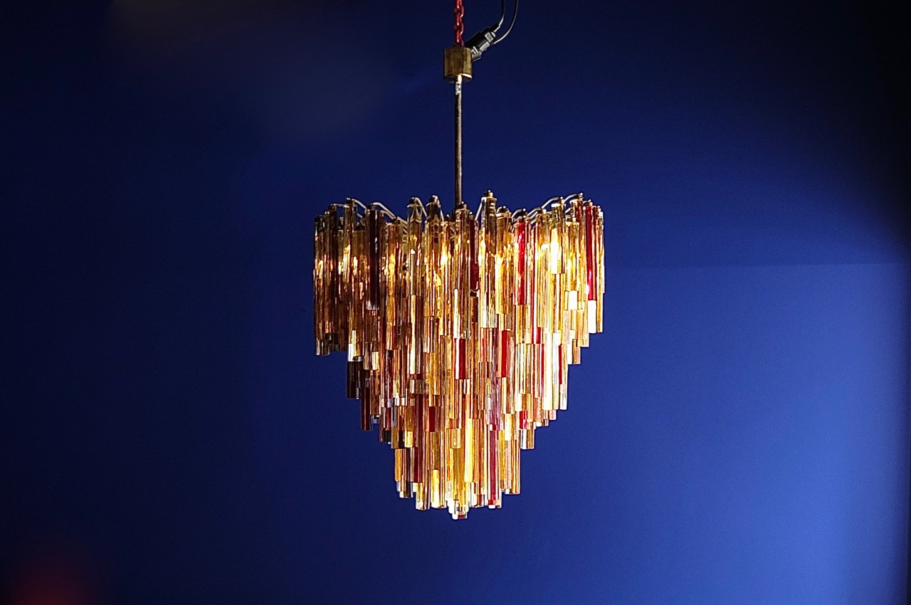 Each chandelier consists of a round steel skeleton with a 4-storey light bulb wreath inside, each light bulb wreath has its own power connection, so you can switch on 4 different light levels (functioning as a dimmer). Each of the glass prisms of different lengths has a brass cuff that serves as a suspension in the skeleton. Glass prisms are all mouth-blown, in the middle there is either a red or yellow round glass rod, encased in clear glass.