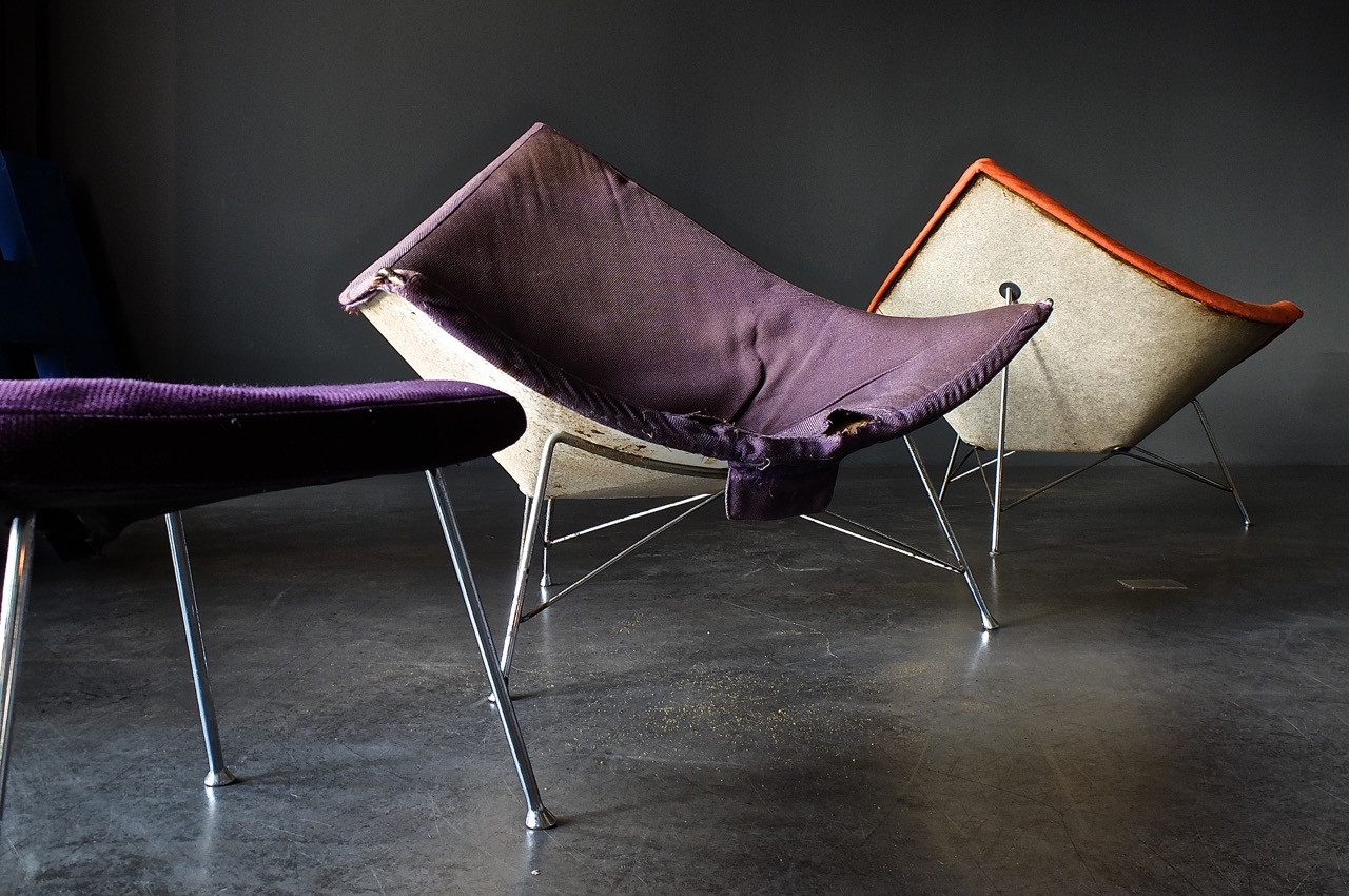 52 years also leave their mark on a Coconut Chair. These two armchairs and a matching ottoman go to the upholsterer on Monday and get a complete overhaul. Only the rusty metal shell, which refers to the first production series, we leave like this.