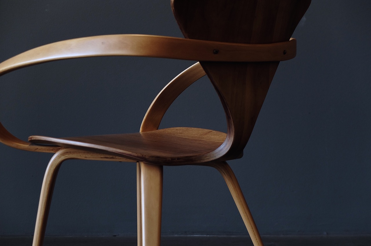 Irgendwie kommt einem diese Stuhlform bekannt vor: Ein bisschen wie eine Mischung aus George Nelson’s Brezel-Stuhl und Arne Jacobsen’s Ameise. Die Verwandtschaft ist aber nicht nur am Material erkennbar (Plywood, gebogenes und gepresstes Sperrholz), sondern sogar ein bisschen enger. In den 1950er Jahren entwickelte die Firma Hermann Miller (als Hersteller auch bekannt für die Eames-Chairs) leichte und günstig zu produzierende Sperrholzstühle. George Nelson als Design Director entwarf 1952 den berühmten „Pretzel Chair“, bis heute eine Ikone des Stuhldesigns. Leider war der Stuhl dann doch nicht so günstig zu produzieren – und er war auch sehr filigran, um nicht zu sagen: zerbrechlich. Daher wurde die Produktion 1957 eingestellt (was auch dazu führt, daß dieser Stuhl heute ein ziemlich teures Sammlerstück ist).