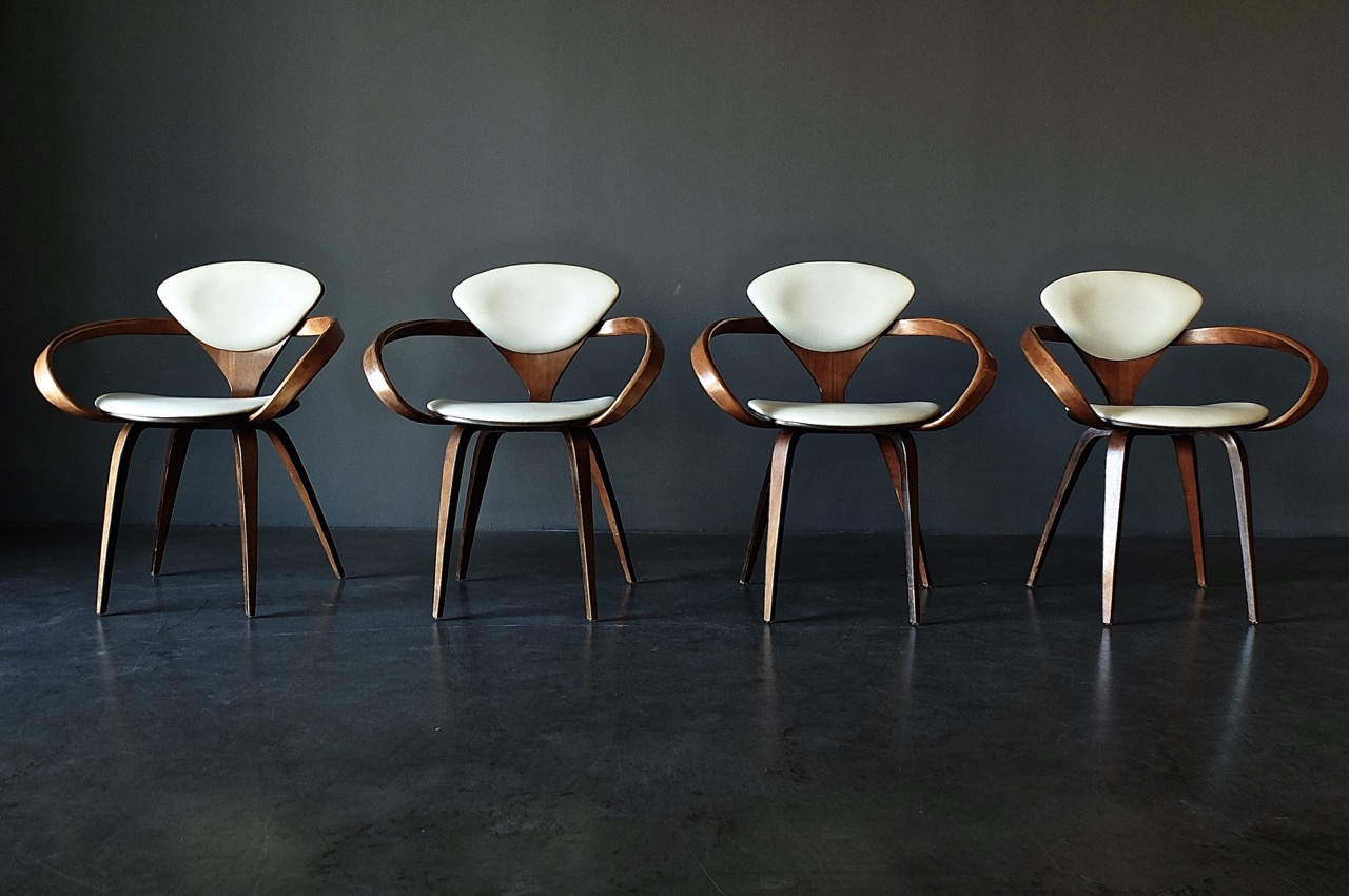 Irgendwie kommt einem diese Stuhlform bekannt vor: Ein bisschen wie eine Mischung aus George Nelson’s Brezel-Stuhl und Arne Jacobsen’s Ameise. Die Verwandtschaft ist aber nicht nur am Material erkennbar (Plywood, gebogenes und gepresstes Sperrholz), sondern sogar ein bisschen enger. In den 1950er Jahren entwickelte die Firma Hermann Miller (als Hersteller auch bekannt für die Eames-Chairs) leichte und günstig zu produzierende Sperrholzstühle. George Nelson als Design Director entwarf 1952 den berühmten „Pretzel Chair“, bis heute eine Ikone des Stuhldesigns. Leider war der Stuhl dann doch nicht so günstig zu produzieren – und er war auch sehr filigran, um nicht zu sagen: zerbrechlich. Daher wurde die Produktion 1957 eingestellt (was auch dazu führt, daß dieser Stuhl heute ein ziemlich teures Sammlerstück ist).