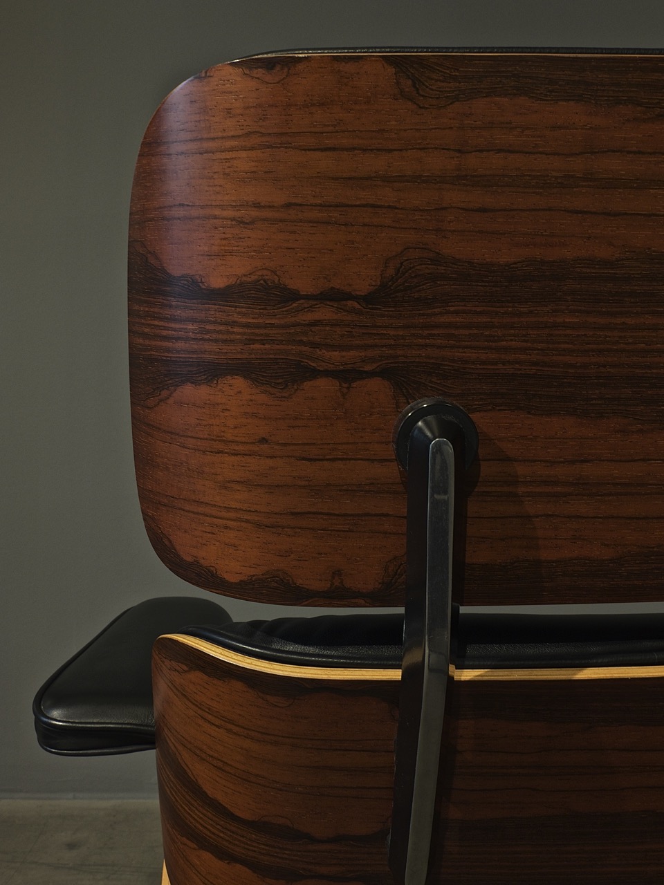 Frisch aus unserer Restaurationswerkstatt: Eames Lounge Chair + Ottoman, Rio-Palisander (mit Cites), grossartige Maserung, schwarzes Original-Leder, komplett restauriert….