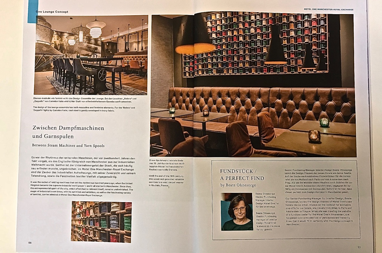 We’ve been working regularly for the Motel One Hotel Group for about 3 years, our objects can be found in Barcelona, Berlin or Manchester. In the Motel One Manchester-Royal Exchange you can find objects retrieved by us in nearly every room, but our most beautiful find decorates the breakfast room. In keeping with the theme of the textile industry, we have supplied a bobbin wall of approx. 6 sqm, consisting of 240 individual yarn bobbins. We found it in Roubaix in the north of France, where it was used around 1900 in a carpet weaving manufacture.