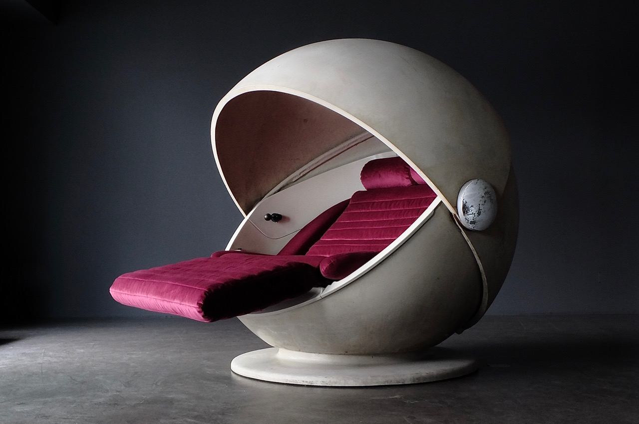 In the midst of this enthusiasm for space travel, new materials and new technologies, a tableware manufacturer placed its first furnishing collection: Rosenthal. The Sunball was developed by sculptor Günter Ferdinand Ris (who had already developed light objects for Rosenthal’s corporate headquarters at Schloss Erkersreuth) together with architect Herbert Selldorf. With lighting and an integrated stereo system, it became futuristic outdoor furniture – the „sun globe for comfortable outdoor living cost around 4000 D-Mark, not even 50 units were sold“. (brandeins, 2015). Today there is a Sunball exhibited in Munich’s Pinakothek der Moderne – and the few remaining copies are traded at auctions at high prices. A real „cocooning“ piece of furniture that we could well imagine as a design object in the entrance hall of a digital agency. Or, of course, as a luxurious television chair for discovering strange worlds.