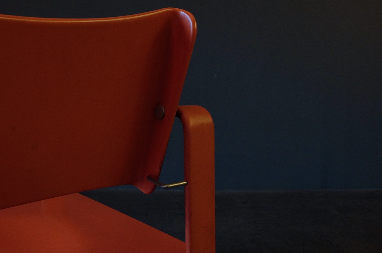 Er besteht aus Schichtholz, gebogen und laminiert. Guter Vintage-Zustand, die korallen-rote Lackierung ist original.