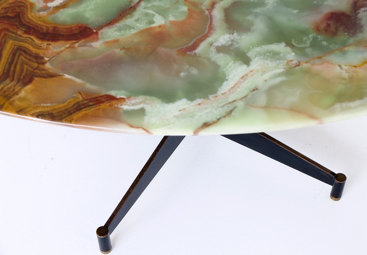 the large onyx plate in a mixture of red and green sits on an elegant midcentury black metal counter framework (four arms with height adjustable ends / four legs). the table is believed to be italian made, while the onyx itself stems from pakistan (this colour only occurs there).