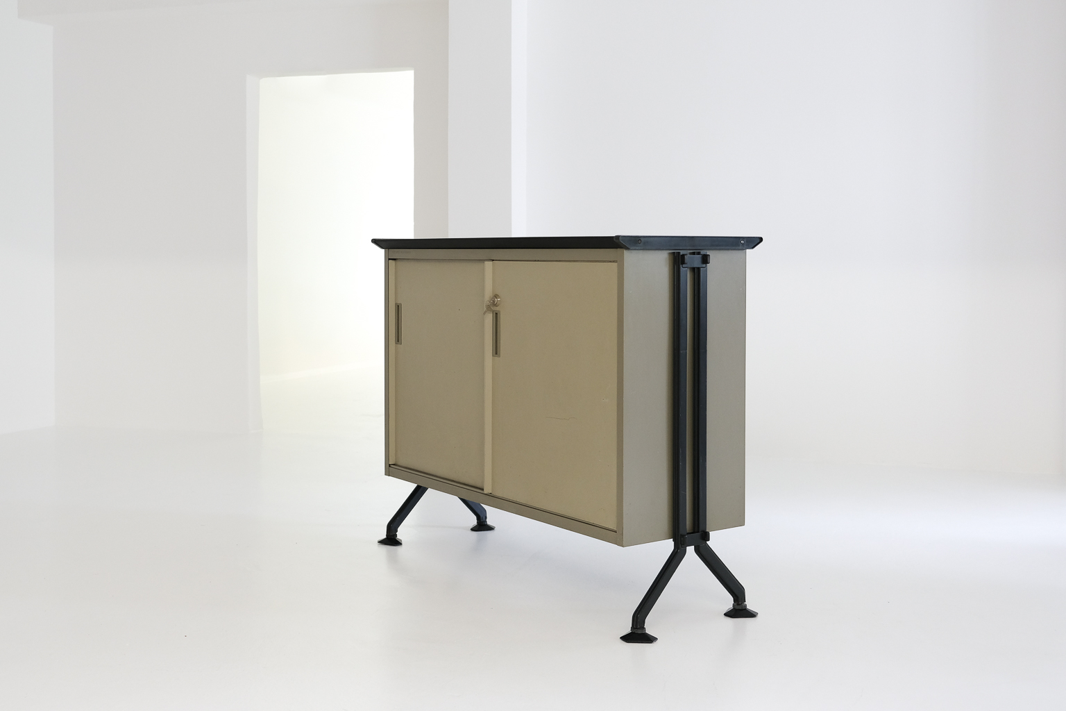 ‚arco‘ highboard, bbpr for olivetti 1963, made of medium grey metal panels and lighter doors in a black frame on angled legs with adjustable hexagonal feet. imprint on the top front: ‚olivetti synthesis‘. dimensions h: 104 cm, w: 129,5 cm, d: 52,5 cm. good original vintage condition, shows signs of use.