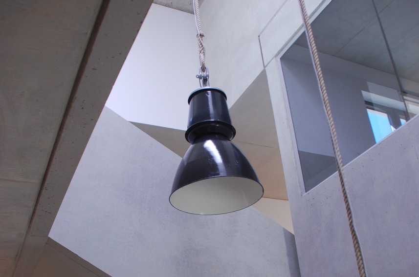 Einer unserer liebsten Projektaufträge in diesem Jahr war die Beleuchtung eines über 4 Stockwerke gehenden Lichthofs in einem Privathaus. Die Lampen waren schnell gefunden, 93 cm hohe tschechische Fabriklampen. Statt der oft gesehenen Ketten oder Stahlseile zur Aufhängung der Lampen, haben wir naturbelassene Hanftaue, an beiden Enden verspreist, genommen. Die Kombi von ungestrichenen Sichtbetonwänden und den Hanftauen ist unschlagbar. Wir wären gern selber eingezogen.