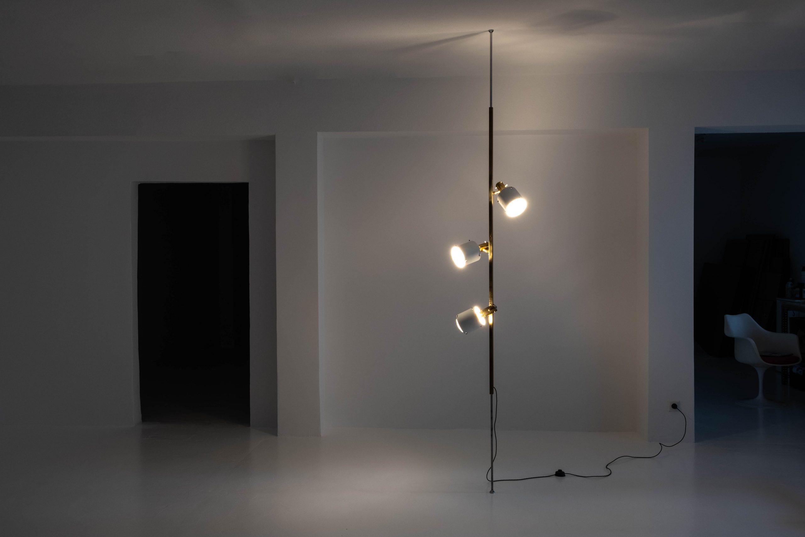 Unique and rare Italian luminaire that is clamped between the ceiling and the floor by an internally seated spring.
