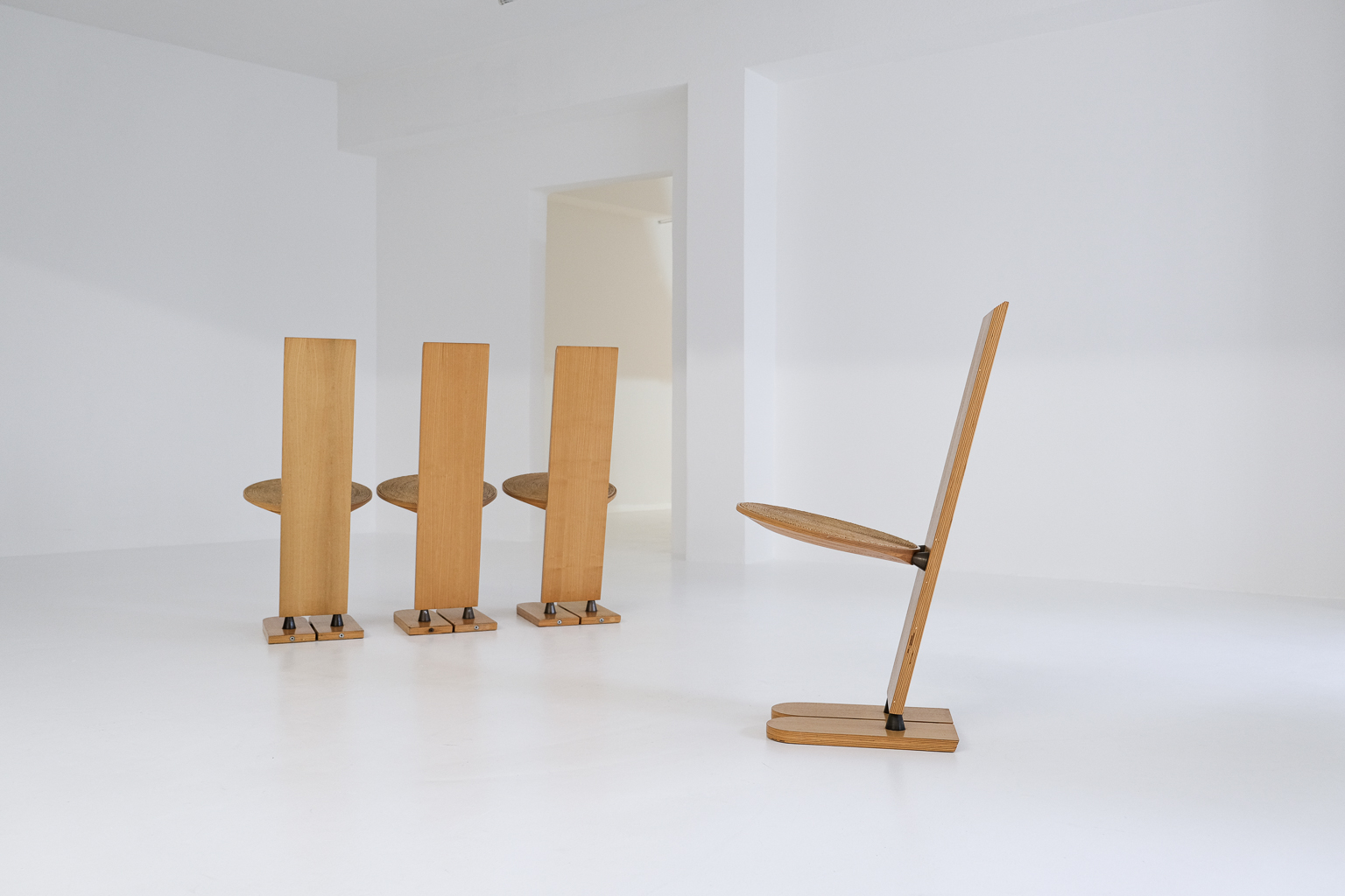 set of 4 „pala“ dining chairs designed by gigi sabadin for emme, italy, ca. 1973. the circular seat is covered with ropework, the sculptural chairs are made of beech plywood. good vintage condition, the chairs shows some signs and losts of wear and use from over the years.
