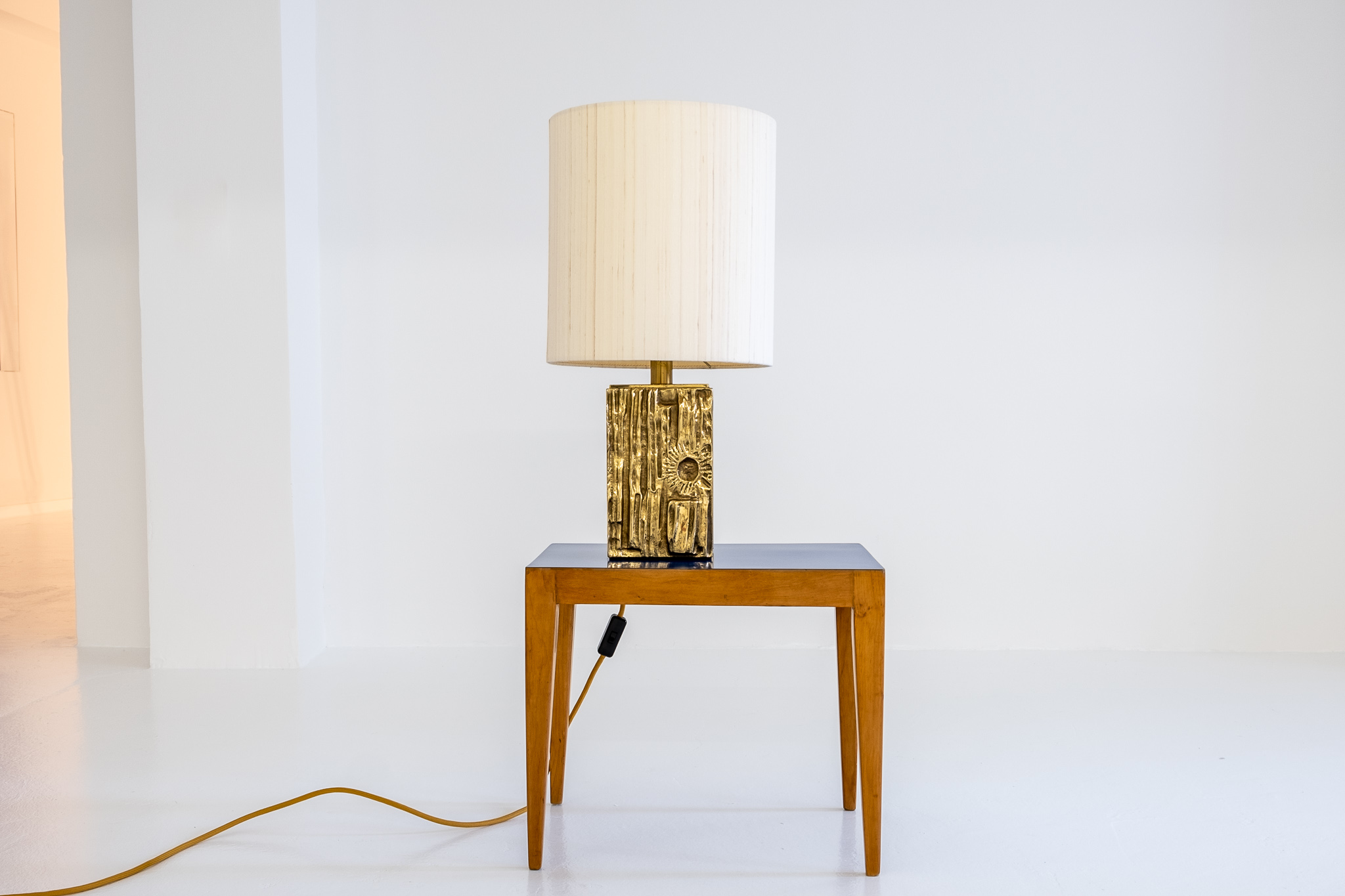 also impressive and very recognizable are his sculptural desk lamps. this lalla lamp has a massive brass foot with cast brass plates front and back, showing a sunset behind trees in an abstract, expressionist style (to be honest: the sunset is our own idea of description).