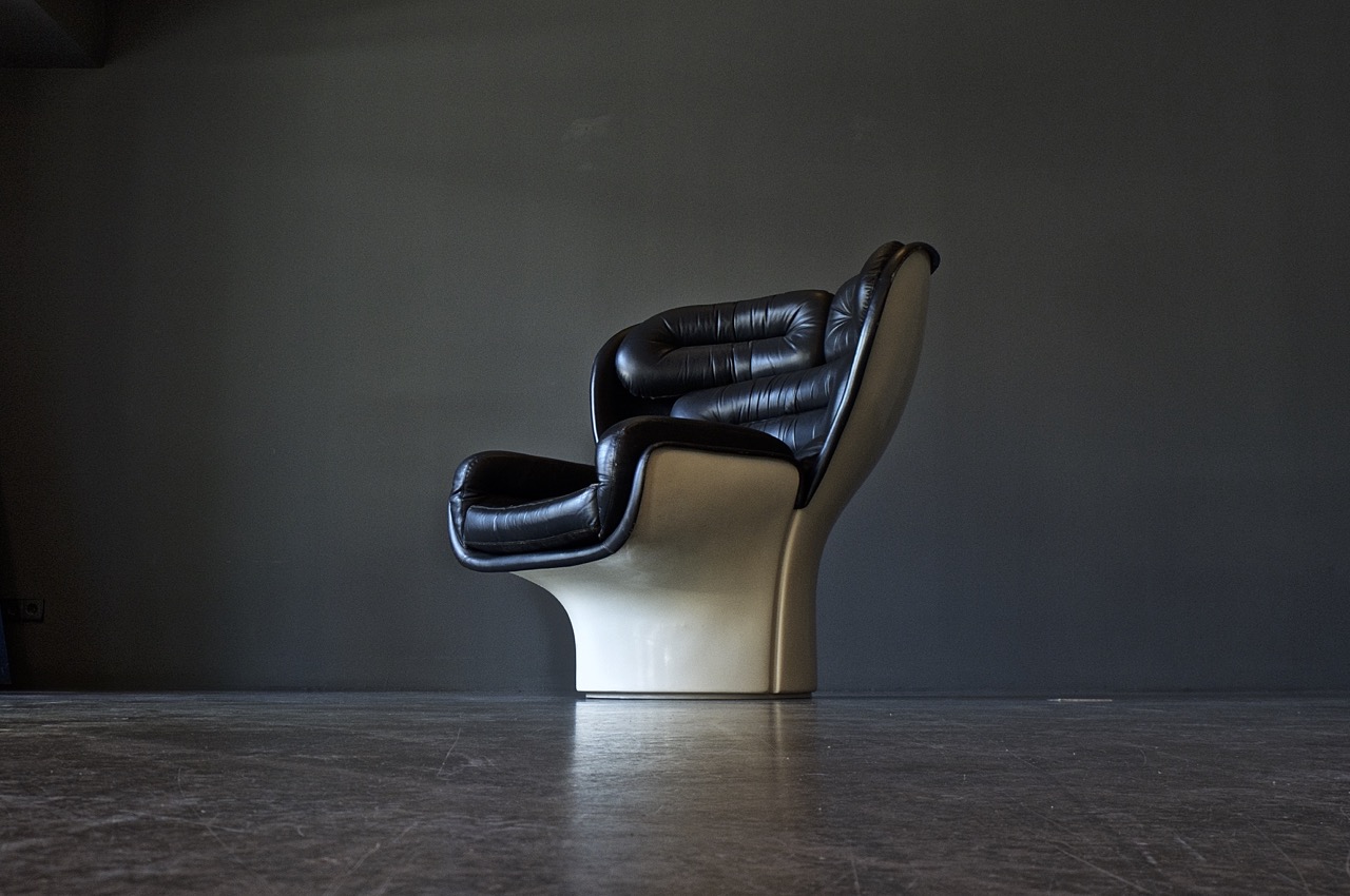 His best-known piece of furniture is the „Elda Chair“, named after his wife and designed 1963. The armchair consists of a fiberglass shell standing on a rotatable, invisible base and is upholstered with thick leather beads. We have an early version in the classic colours black and white currently in the showroom, good vintage condition.
