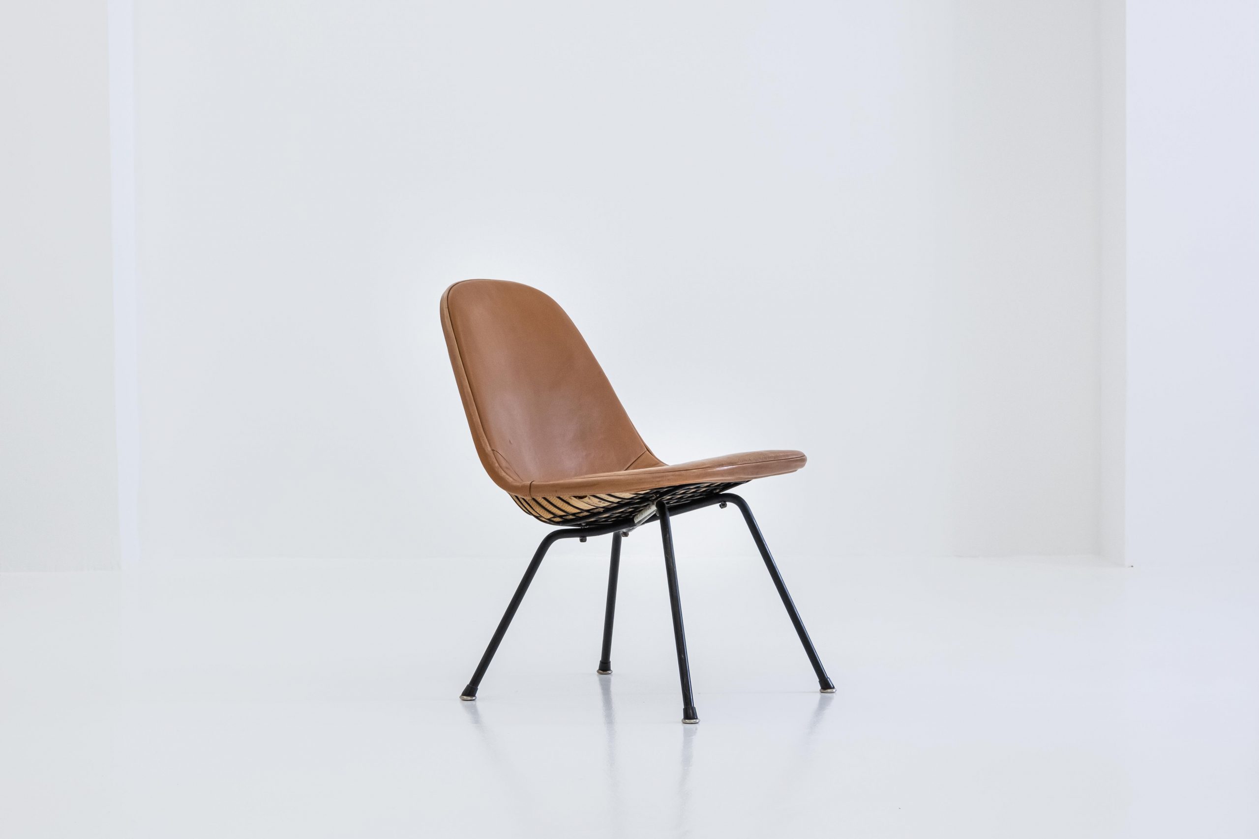 really rare: the most deluxe version of the eames upholstered wire chair with a tan (light brown) leather full cover. first presented in 1951, there were two sizes available: dining height (dkx) and lounge height (lkx), with full (-1) or bikini (-2) cover. charles eames described the design process in an 1958 article in ‚interiors magazine‘: „it was in the most desperate hours, when there seemed to be no hope of getting the perfect molding for the reinforced polyester chair, that the upholstered wire chair was conceived. (…) we thought we would go to the opposite extreme and do a molded, body-conforming shell depending on many, many connections—but connections that we as an industrial society were prepared to cope with on the production level. if you looked around you found these fantastic things being made of wire—trays, baskets, rat traps, using of a wire fabricating technique perfected over a period of many years. we looked into it and found that it was a good production technique and also a good use of material. before the molded plastic chair had been solved, the molded wire chair was well under way.“