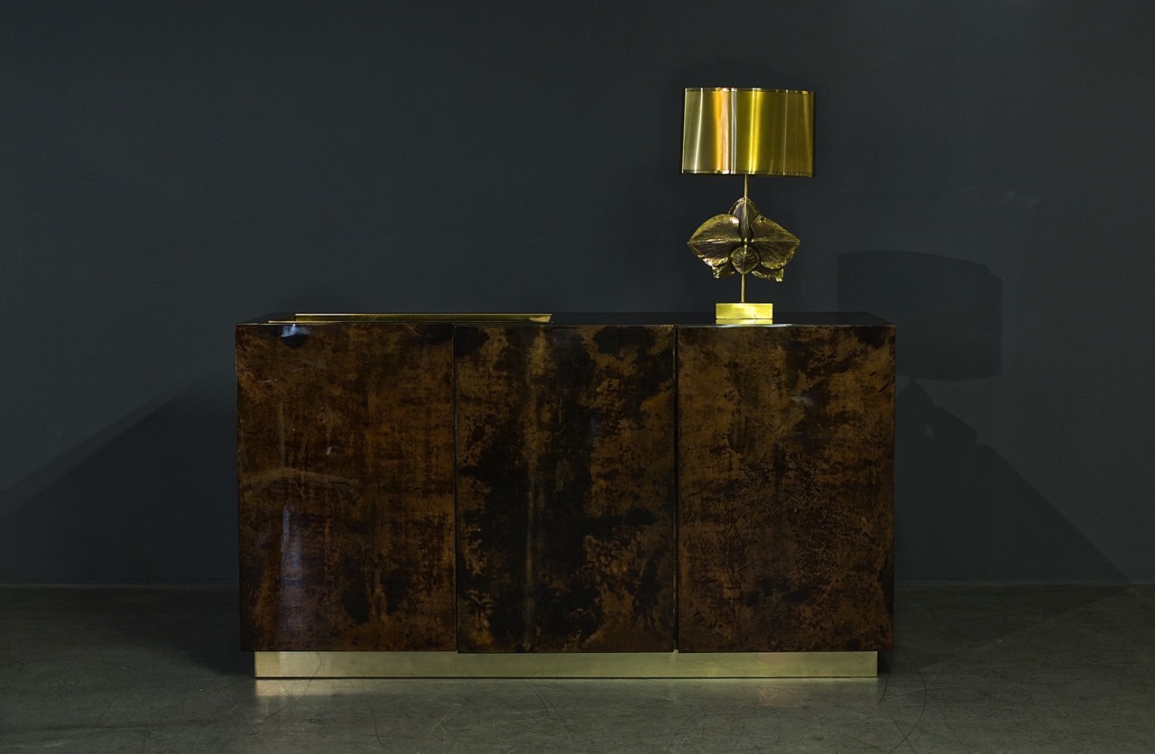 Der italienische Designer Aldo Tura (1909 – 63) ist für seine ebenso eigenwilligen wie glamourösen Oberflächenveredelungen bekannt. Zum Beispiel lackierte Ziegenhaut.