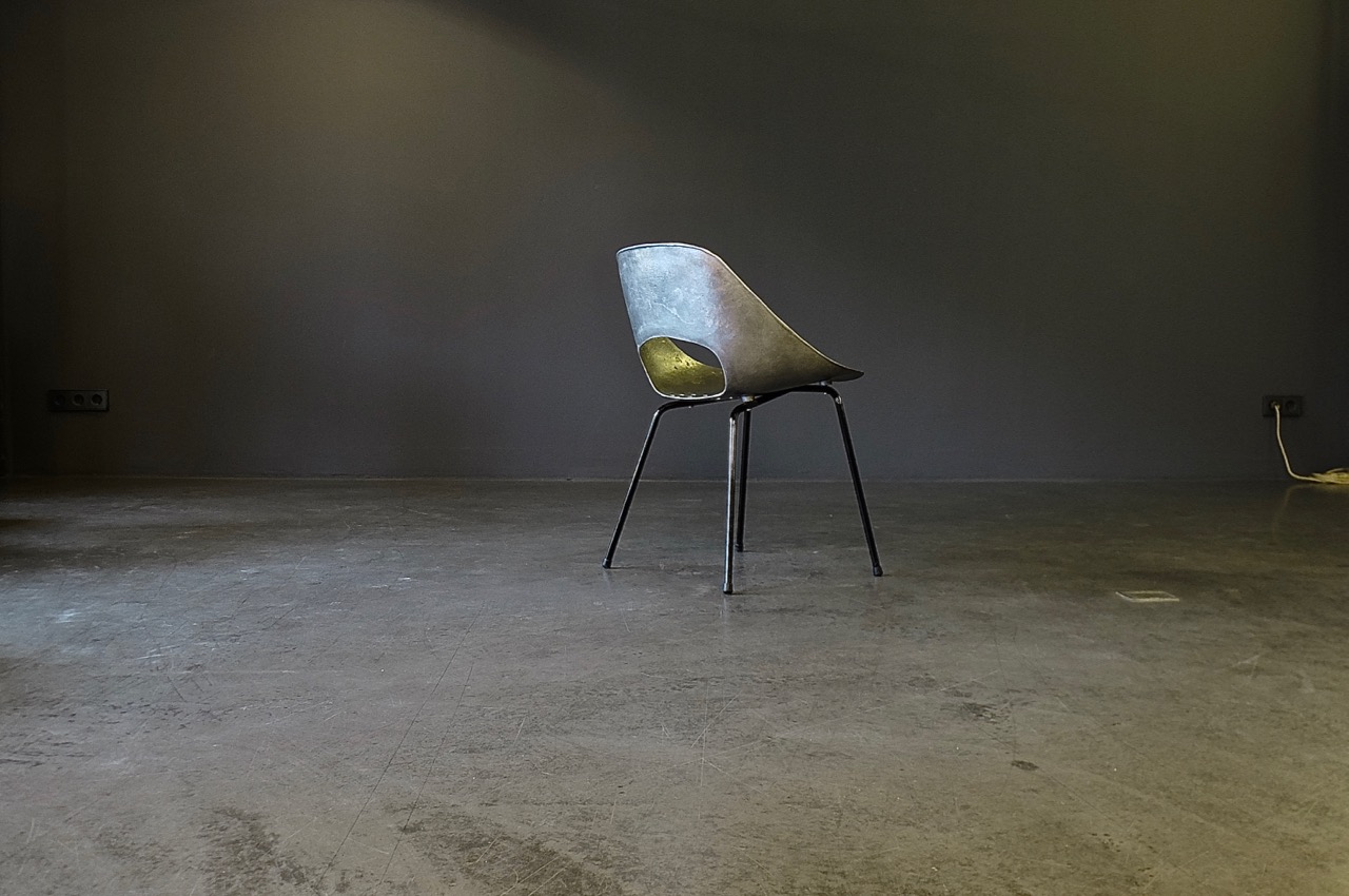 In our showroom finally we’ve got again an exemplar with the cast aluminium seat shell. This example was clearly used outside, recognizable by the holes in the seat that were added later, so rainwater doesn’t remain in the seat shell.