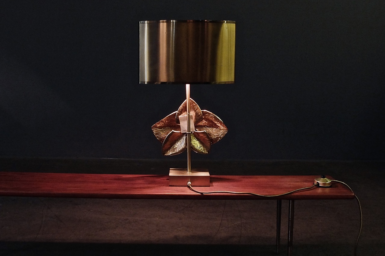 Wir haben insgesamt 3 Maison Charles-Leuchten zur Zeit im Showroom, das hier gezeigte Modell ist die Orchideenblätter-Tischlampe (1981 mit dem LAMPE D’OR design award des SALON INTERNATIONAL DU LUMINAIRE DE PARIS ausgezeichnet).