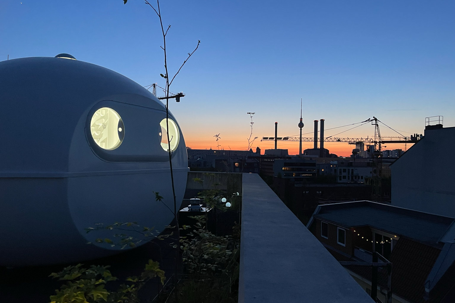 A top-restored banga is available for rent as a vacation apartment above the rooftops of Berlin. The space-age-tiny-house was installed on the roof of the ‚Passivhaus Engeldamm‘ – in the middle of the city, on a 80sqm furnished roof terrace with panoramic view (and outdoor shower), walking distance to the Spree and the Museum Island, the East Side Gallery and the Berghain club. The location is unique – especially when you look out of the small sliding windows into the starry sky (or onto the Berlin TV Tower on Alexanderplatz) at night. The small space capsule offers 2 sofas / 4 beds, kitchenette, toilet, shower and sink (and in the stairwell of the building there is an additional, larger washroom for private use).