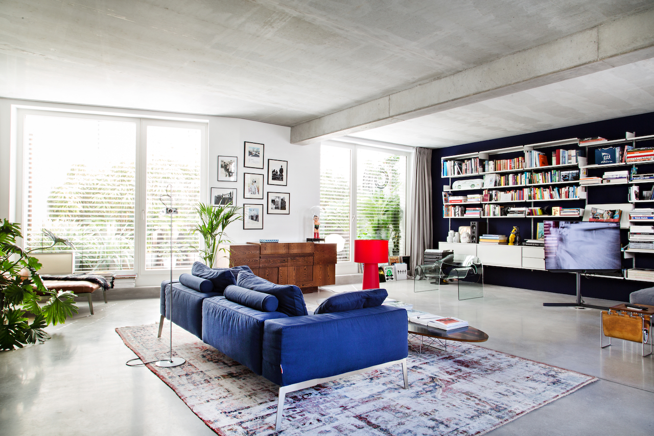 this apartment in a new building in hamburg was purchased as a “refined shell”, i.e. without the finishing touches, which the owners were then able to determine themselves. they followed our suggestion and dispensed with all partitions, instead creating two bedrooms by inserting cupboard walls that could be used from both sides. all the cupboards were clad with american walnut veneer, sourced from a single tree, so that the grain is continuous. the unclad concrete ceiling with visible ventilation pipes was left, supplemented by a concrete screed with underfloor heating. the warm grey surfaces above and below are contrasted by strongly colored wall surfaces – particularly intense with natural pigments from le corbusier’s color palette.